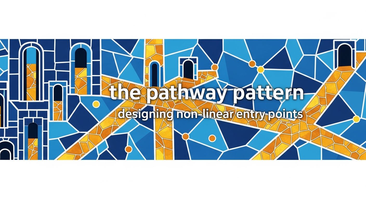 The difference: a pathway assumes everyone enters at the same point and progresses in the same direction. Pathway architecture creates multiple entry points, multiple exit points, and multiple ways to progress between them.